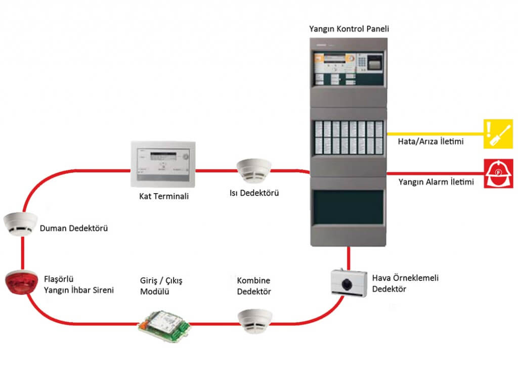 Algılama: Duman, ısı, alev veya gaz gibi yangın belirtilerini tespit eden çeşitli dedektörler, yangının ilk anlarında alarm verir.